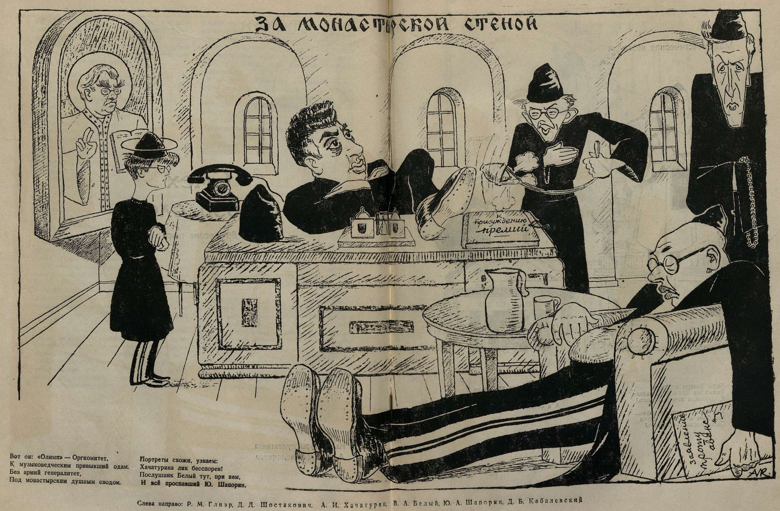 Слева направо: Р. М. Глиэр, Д. Д. Шостакович, А. И. Хачатурян, В. А. Белый, Ю. А. Шапорин, Д. Б. Кабалевский