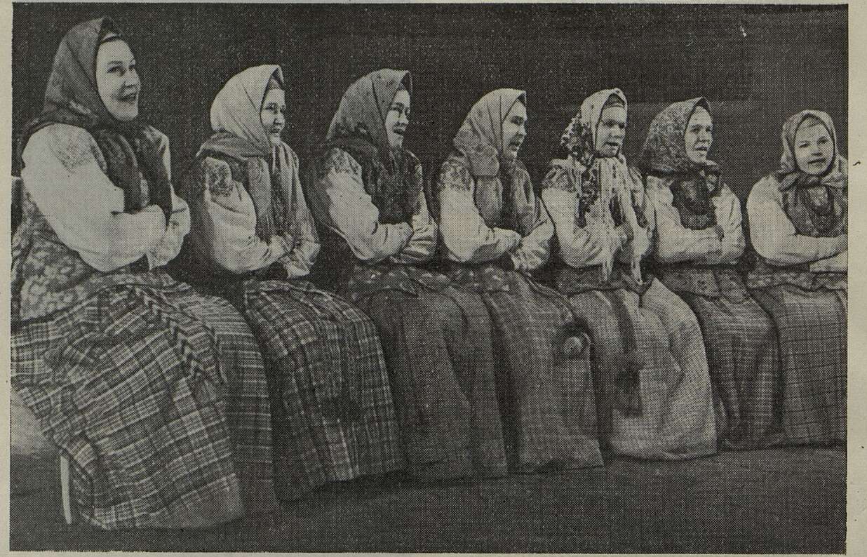 Мастерицы-песенницы старшего поколения принесли в хор и ткацкое искусство, исключительно богатое по краскам и орнаменту: пояса, полотенца, скатерти, расшитые старинной вышивкой кружева. Работы этих ткачих в последние годы демонстрировались на выставке, проведенной Всесоюзным Домом народного творчества в Центральном парке культуры и отдыха в Москве, в городах Прибалтики и в последнее время в Ленинграде. Некоторые из них получили за эти работы персональные премии.