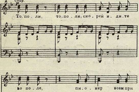 порывом трудового соревнования, молодые друзья лесов вместе со всем народом борются за превращение своей страны в плодороднейший край социалистического изобилия. Пионеры радуются первой лесозащитной поросли — делу рук своих. Весело, с ребячьим задором, по-вешнему звенит трогательная по своей простоте и непосредственности песня юных лесоводов. К сожалению, эта обаятельная песенка, так горячо принятая аудиторией, очень коротка и неожиданно обрывается: