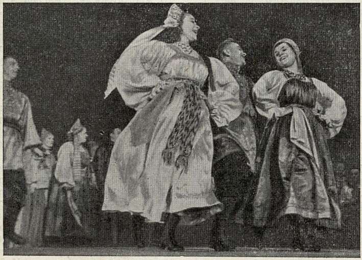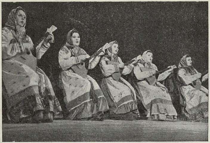 Наконец, мы услышали народную игровую песню «Уж я, матушка, неженат хожу». В ней хор находит себя, и мы слышим северную песню во всем обаянии ее многоголосия, тембра, распева. Однако впечатление от этой хорошей песни снижается, когда видишь, что происходит в это время на сцене. Группа хора «играет» песню. Но сколько наивного, натуралистического в этой игре, не связанной с хороводными народными играми, с их строгой поэтичностью, изяществом жеста! Это же, но еще в большей мере повторяется в игровой песне «На перевозе», где «игра» переходит в дешевую пантомиму, а солистка Лаптева поет в... опереточном стиле. Первое отделение закончилось пляской «Моряки у односельчан», важной по теме, но исполненной опять-таки в плане эстрадного дивертисмента.