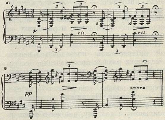 О том, насколько важно, например, гармоническое обогащение мелодической интонации для ее образной выразительности, можно судить, сравнив начальные такты первой части Второй сонаты Скрябина с заключительными тактами этой же части. Первая часть и начинается и кончается мотивами, основанными на одной и той же мелодической интонации. Но как изменяется ее характер в конце!
