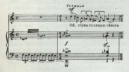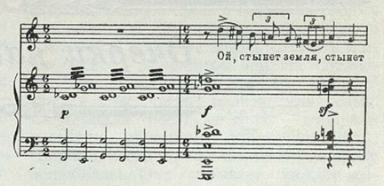 Бесспорно, в этих гармониях, несмотря на их чисто красочный, нефункциональный характер, есть своя реалистическая выразительность: это образ злой стихии, мрачного, тягостного предчувствия. Сперва кажется, что эти гармонии должны прийти в противоречие с последующими глубоко народными песенными образами. Но этого не происходит. Наоборот, после этих гармоний особенно рельефно и выразительно звучит песенно-народная тема траурного хора. Думается, что такого рода гармонические новшества, содействующие усилению драматической выразительности в советской музыке, вполне оправданы. Борьба с формализмом, с кабинетным изобретательством не исключает творческого новаторства, наряду с широким использованием и претворением всех традиционных выразительных средств.