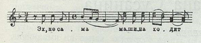 Ведь и народ не только сохраняет и переосмысливает старое в своем песенном искусстве, но в процессе обогащения, развития национального интонационного стиля создает и новые интонации, новые мелодические, ритмические, ладовые обороты. Привлекает, например, своеобразный, полный юмора оборот большой септимы в современной народной песне «Не сама машина ходит». Этот оборот не был общеупотребителен в старой народной песне. Его ввели в практику современные народные певцы: