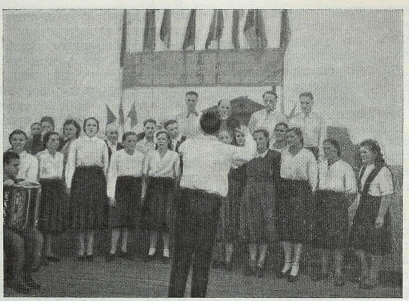 В составе хора — рядовые колхозники, бригадиры, трактористы, сельская интеллигенция. Поют в хоре председатель сельсовета Н. Кузнецов и председатель колхоза К. Успенский. Поет избач Н. Потехин, он же и парторг колхоза, молодой порывистый парень лет 26–28, с открытым скуластым лицом и доброй улыбкой. Поют старики-колхозники Н. Вихарев и М. Шустин, которого в деревне за преклонный возраст, степенность и мудрую простоту речи шутливо величают свояком Сусанина. А рядом с ними в хоре стоят совсем юные девушки — медсестра, учительницы из домнинской школы, заведующая магазином.
