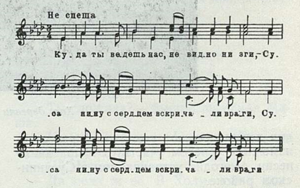 В Домнине вот уже свыше пятнадцати лет существует небольшой хор. Это дружный, сплоченный коллектив. Он возник по инициативе Федора Никифоровича Овсянникова, старого любителя пения. В годы войны, когда народ с новой силой ощутил кровную связь с великими своими предками, в домнинском хоре как-то сама собой возникла мысль сложить песню о своем знаменитом земляке Сусанине. Часть текста вычитали из каких-то старых книг, часть присочинили сами. Складывали песню не сразу — отбирали варианты, проверяли, прислушивались... Наконец песня была исполнена и сразу полюбилась. Она открывает каждое выступление хора. Успех и популярность этой, песни в Сусанинском районе огромны: