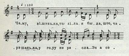Многие иные песни тридцатых годов претерпели в народном быту значительные изменения, что выразилось в развитии и совершенствовании текстов и напевов. Вот, например, как звучала в конце тридцатых годов и даже в первые послевоенные годы колхозная песня «Вишенька», известная тогда только в Могилевской области: