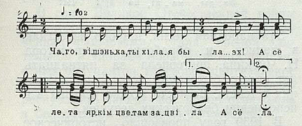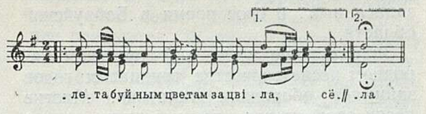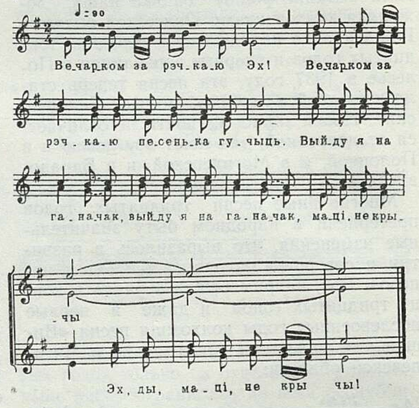 Обогащение поэтического текста повлекло за собой дальнейшее развитие напева путем введения подголоска, который логически продолжил первую музыкальную фразу запева. В этом примере ярко выражен один из характерных приемов мелодического развития в белорусской народной песне — как традиционной, так и современной.
