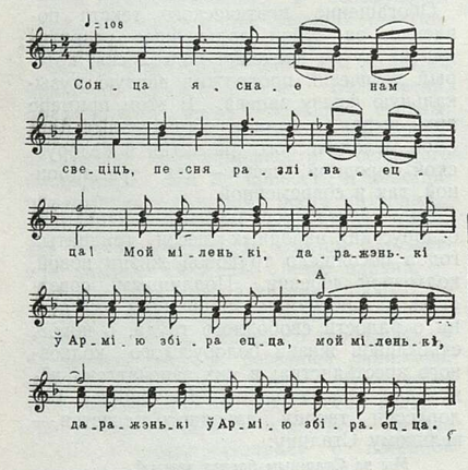Значительное место в белорусском народном песнетворчестве тридцатых годов занимает оборонная тематика. Многие песни этого цикла не утратили своего жизненного значения и поныне. Приведу для примера частушечную песню «Сонца яснае нам свецiць» о проводах молодого бойца в Советскую Армию (известную в записи и обработке композитора Н. Соколовского):