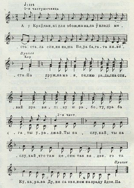 Частушки сложены в Василевичском колхозном хоре (Полесская область). В них названы имена знатных людей колхоза — Героя Социалистического Труда Евдокии Кухаревой и ударницы Веры Кравченко (кстати, обе они являются не только героями колхозного труда, но и активными участницами хоровой самодеятельности). В самодеятельном рабочем хоре одного из передовых белорусских предприятий — Совхоза имени 10-летия БССР — сложена песня-частушка о лучших производственниках совхоза:
