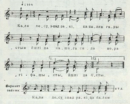 Отметим любопытную деталь: старинная песня «Агурочкi» завершалась ферматой; в новом, «партизанском» варианте этой же мелодии протяжное заключение исчезло, растворившись в маршевом