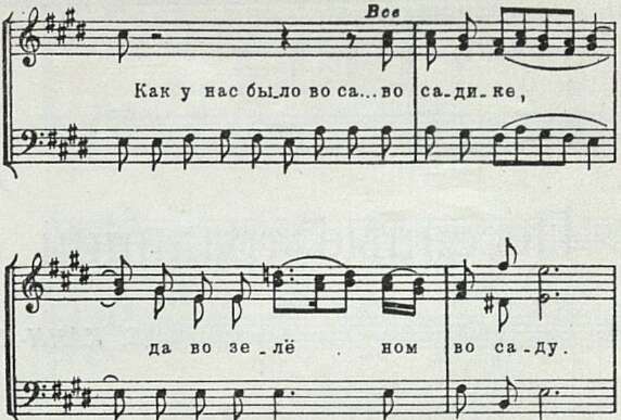 Во время исполнения последнего припева входят парни, здороваются молча и запевают живую хороводную песню «Как у нас было во садике». Девушки вступают немедленно. Песня льется легко, свободно, широко: