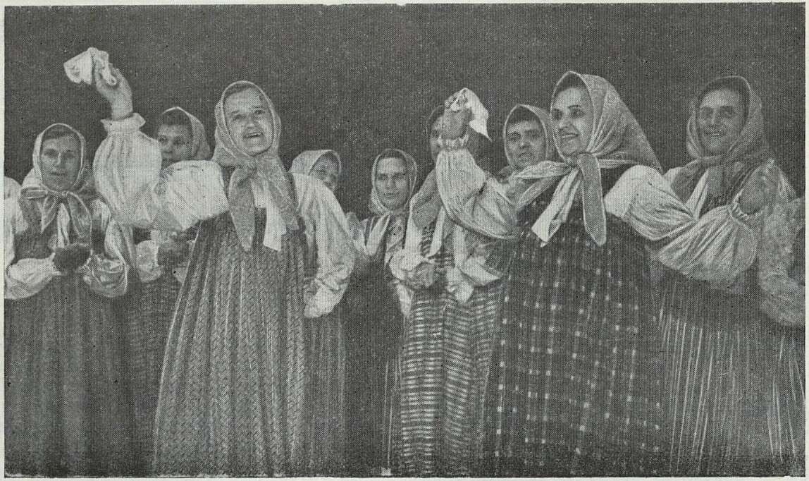Свои песни красноармейские ткачихи очень любят слушать по радио. Однако они весьма ревнивы к неоправданным изменениям, которые допускают исполнители-профессионалы. Нередко какой-нибудь неверный мелодический ход или даже возглас («ах», «эх да», «ой» и т. д.) вызывает чуть ли не целую дискуссию. Но суть спора сводится всегда к тому, чтобы как можно точнее и художественнее передать содержание песни. Особенно строга и взыскательна старейшая из певиц — Елизавета Васильевна Гусева, высокая седая женщина, очень стройная, несмотря на свои шестьдесят два года. Ее песенный запас не очень велик, но мастерство варьирования подголосков, чуткость и тонкость ее суждений о многоголосной песне поразительны.