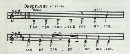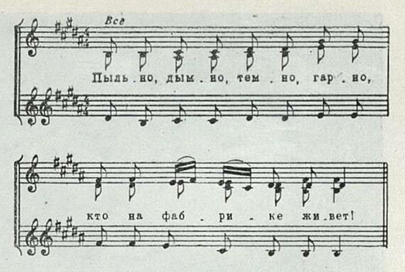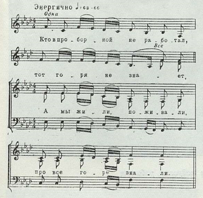 Интересна другая старая рабочая песня — «Пыльно, дымно...», рассказывающая о тяжелом, каторжном труде фабричных рабочих до Октябрьской революции. Очень выразителен в исполнении хора дважды повторяемый припев: