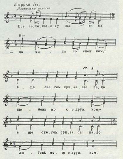 Так появилась первая созданная коллективно песня «Все зеленые лужаечки», подкупающая проникновенным лиризмом музыкального образа: