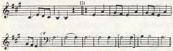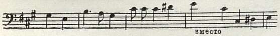 Когда приходится употреблять мелодию в тональности или слишком высокой, или слишком низкой для голоса, тогда могут быть некоторые ноты в мелодии перенесены в другую октаву. Например, такая мелодия (из Мессии № 31) в басу излагается второй раз в E-dur несколько иначе: