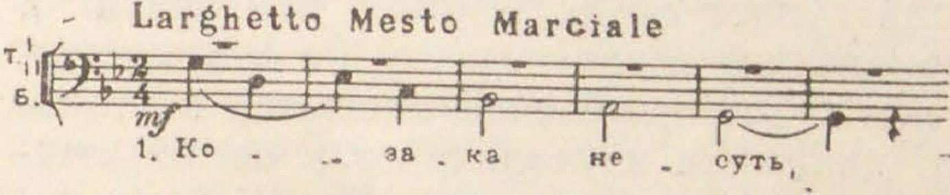 Одним из самых замечательных сочинений Леонтовича является песня «Козака несуть». Это вдохновенный траурный марш, народный реквием, посвященный памяти безымянного героя-казака.