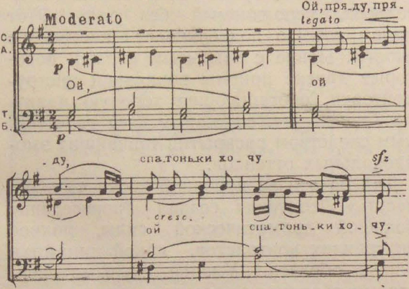 Показательна в этом смысле известная песня «Пряля», повествующая о тяжелой жизни молодой женщины, попавшей в чужую семью. Начинается песня небольшим вступлением; на фоне приглушенного звучания басов, теноров и альтов сопрано поют замечательную мелодию, полную тихой грусти и внутренней сосредоточенности: