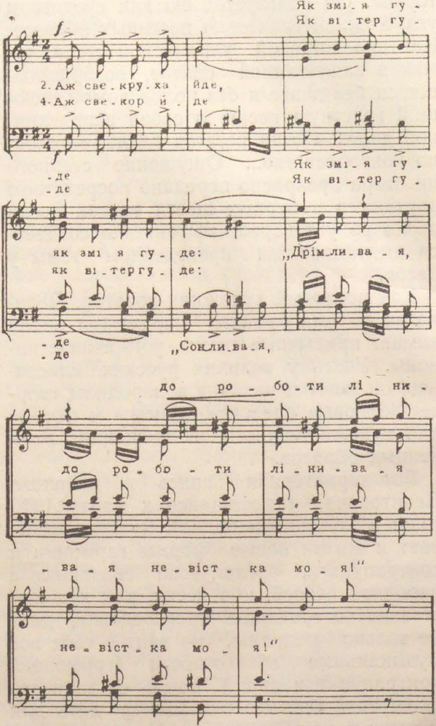 Но вот картина меняется: появляется сварливая свекровь, которая «как змея, гудит», злобно браня невестку. После мягкой звучности первого куплета — резкoe forte c тяжелыми акцентами на каждом звуке. Сначала мелодия изложена унисоном всего хора, затем ее ведут басы, а остальные голоса расходятся в разные стороны; весь этот эпизод отличается драматической напряженностью звучания: