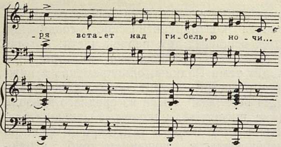 Мелодия запева по характеру близка начальной теме кантаты; она звучит одновременно со вторым проведением этой темы в оркестре, образуя «противосложение» к ней. Хоровой припев, органично продолжая песню, должен воплотить, по мысли автора, образ «колышущихся трудовых знамен».