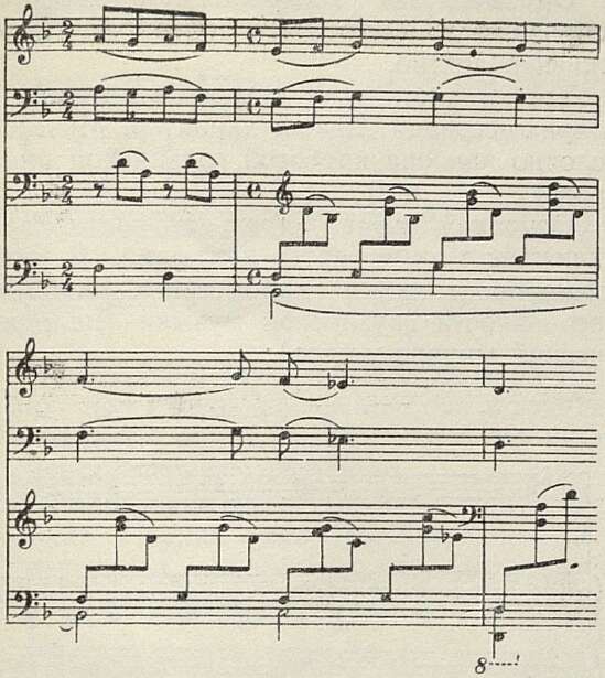 В среднем разделе третьей части вновь появляются черты жанровой картинности. Это характерная бытовая сценка, возникшая на фоне безмолвного ночного пейзажа.