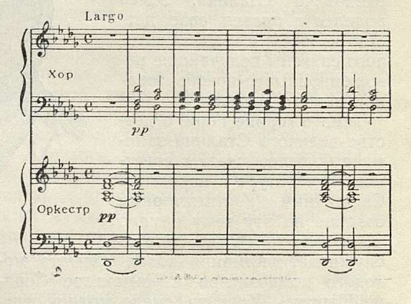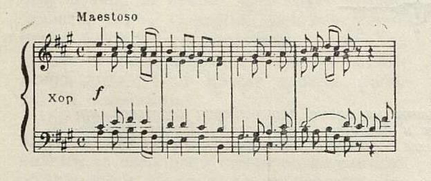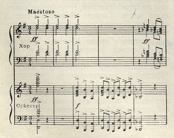 в характере торжественной массовой песни. Эту песенную мелодию — основную тему первой части — исполняет хор после импозантного, постепенно разрастающегося оркестрового вступления: