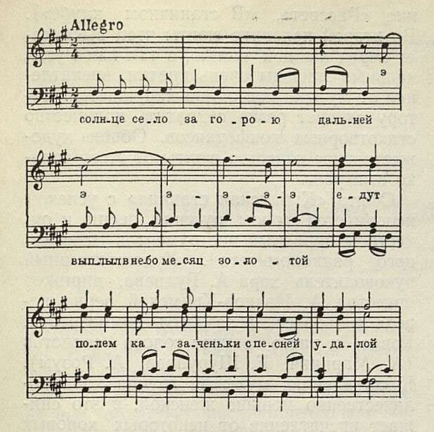 Творческая фантазия композитора недостаточно ярко проявилась и во вступлении, также лишенном, художественного размаха. Видимо, А. Мосолов еще не достиг той степени владения народно-песенным материалом, которая позволила бы ему самостоятельно создать на его основе большие, обобщенные образы. Композитор любуется песней, обрабатывает и украшает ее, но недостаточно подчиняет песенные темы своей творческой задаче.