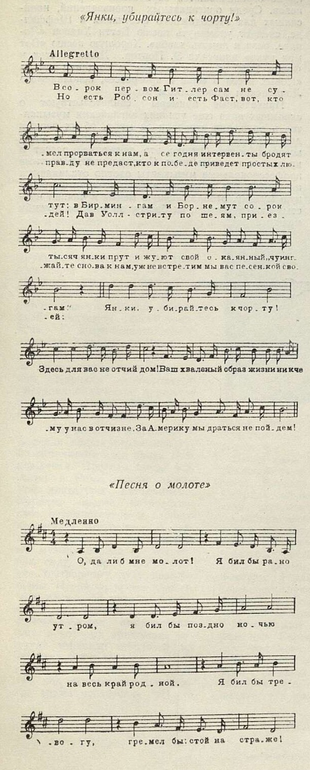 Музыкальное рабочее общество выпустило сборник из шестидесяти песен подобного рода, включая оольшое количество популярных старых напевов с новыми текстами. В сборник вошло также несколько мексиканских и негритянских песен. Среди произведений зарубежных композиторов завоевавших любовь английского народа в сборнике напечатаны песни из музыки И. Дунаевского к кинофильму «Кубанские казаки», «Налево мост, направо мост» польского композитора А. Градштейна, американская «Баллада о Пикскилле».