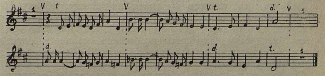 Наконец, точная повторность отрезков мелодической линии также вовсе не должна быть признана обязательной. Некоторое общее сходство отдельных построений оказывается достаточным для быстрого усвоения целого (см. «Первое мая»).