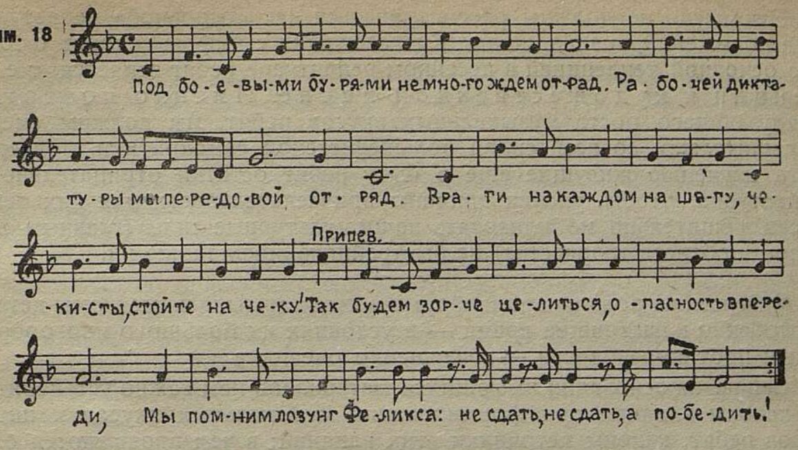 Сказанное выше о недостатках многих революционных песен на так наз. «общую» тематику и часто отрицательное отношение к ним со стороны ребят еще, разумеется, не говорит о ненужности таких песен в детском репертуаре, но указывает, во-первых, на необходимость в данных условиях формирования вкусов ребят иметь в виду тяготение их (совершенно обоснованное) к конкретной тематике; во-вторых, указывает на необходимость других качеств, как в отношении художественности, яркости текста, так и соответствующих средств музыкальной выразительности (что в значительной мере имеется в «Партизанской» песне).