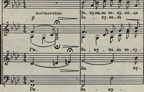 Разнообразна хоровая фактура: певцы имитируют инструментальное звучание, в