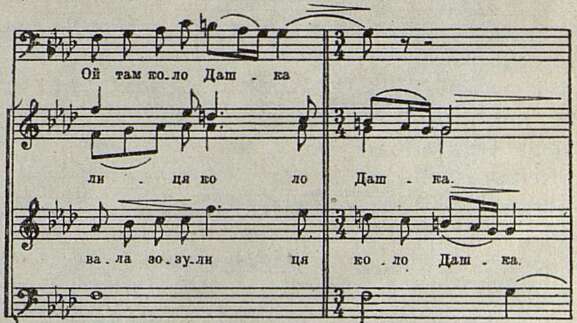 Пример удачного переосмысления традиционных для фольклора выразительных средств — песня «Ой, у горах, у Карпатах» (для женского хора, текст М. Капустяка). Здесь мы встречаемся с темой, которая все шире звучит в творчестве композитора, — дружба народов1. Эпический характер повествования, речитативная мелодика песни-сказа ассоциируются с украинскими народными думами.
