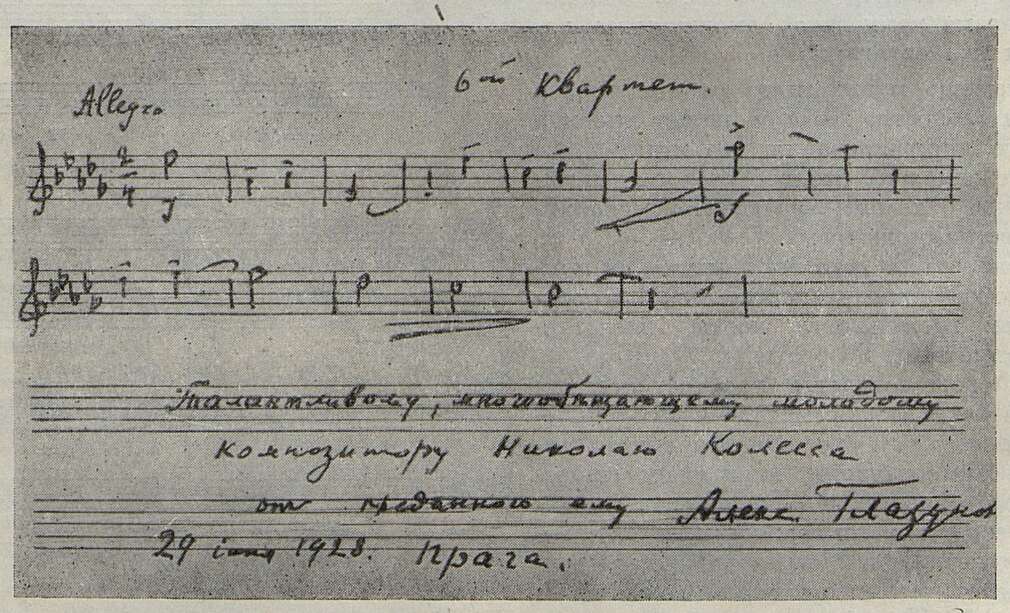 встреча с Глазуновым. После концерта выпускников консерватории, где исполнялось первое симфоническое произведение Колессы «Украинская сюита», Глазунов, бывший тогда проездом в Праге, пригласил его к себе и подарил на память лист нотной бумаги с первыми тактами Шестого струнного квартета и сердечной надписью.