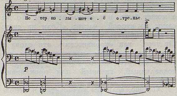 Следующий отрывок из среднего раздела второй картины подтверждает это достаточно красноречиво. Ни тип мелоса и гармонического изложения, родственные Мусоргскому, ни прием драматического нагнетания, взятый из арсенала театральной музыки Прокофьева, не лишают образ индивидуальной выразительности. Один, казалось бы, незначительный характерно прокофьевский штрих, повисающая октава звука «ми» в высоком регистре флейт и скрипок, — и перед глазами вся картина, щемящая своей правдивостью: развевающиеся по ветру, словно живые, одежды убитой женщины: