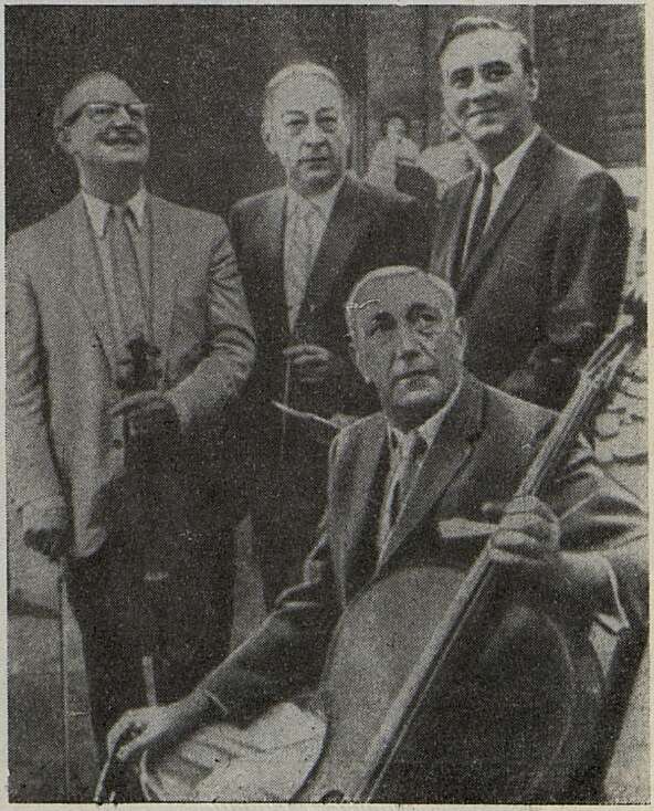 При музыкальном факультете университета Южной Калифорнии создан «Институт высшего мастерства». Класс скрипки ведет Яша Хейфец, виолончели — Григорий Пятигорский, альта — Уильям Примроз. На фото: У. Примроз, Я. Хейфец, Г. Пятигорский и пианист Леонард Пеннарио.