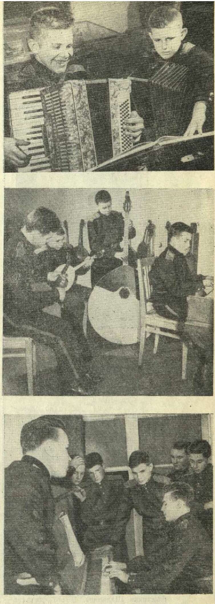 Читаем таблички на дверях: «Класс музыки», «Класс танцев», а рядом «Радиокласс», «Химический класс», «Класс стрелкового оружия»... Как все это похоже и непохоже на обычную школу! Как будто те же мальчишки, тот же шум перемены, те же «серьезные» ребячьи заботы, но во всем ощущается особый четкий ритм жизни училища, особая деловитость, собранность. Вот по коридору бежит совсем маленький мальчишка, видно, из младших классов. Задорный белобрысый вихор на голове, алые погоны с золотыми буквами «МСУ» на них, а в руках большой, почти вполовину его роста, баян. На наш вопрос, как найти начальника клуба, он указал на кабинет в конце коридора и, тяжело дыша, деловито поспешил дальше.