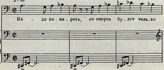 В опере «Скрипка Ротшильда» много интереснейших подробностей, разбор которых помогает уяснить особенности авторской манеры письма и глубже проникнуть в замысел целого. Так, например, композитор добивается своеобразного эффекта, сочетая одухотворенную, поэтичную музыку с подчеркнуто обыденными, неприглаженными, чуть-чуть корявыми бытовыми оборотами, которыми изобилует речь героя. Однако рамки журнальной статьи не дают возможности углубиться в детали. Ограничимся поэтому одним моментом — разберем эпизод, непосредственно предшествующий финальной сцене. В своих раздумьях Бронза приходит к парадоксальному выводу: если от жизни человеку одни убытки, то от смерти — прямая польза: «не надо ни есть, ни пить, ни платить податей, ни обижать людей, а так как человек лежит в могилке не один год, а сотни, тысячи лет, то, если сосчитать, польза окажется громадная». Композитор превратил этот эпизод в драматическую кульминацию оперы. Как же это сделано? Мрачный юмор текста подчеркнут подвижной мелодией, несколько напоминающей еврейские плясовые напевы. Динамичности, активности образа способствуют и танцевальный ритм, и упорные возвращения к начальному звуку, и своеобразный лад, в котором фа мажор сопоставляется с си бемоль минором (лад, встречающийся в ряде восточных культур, в частности, в еврейской народной музыке):