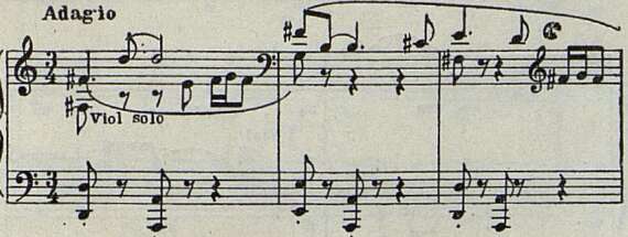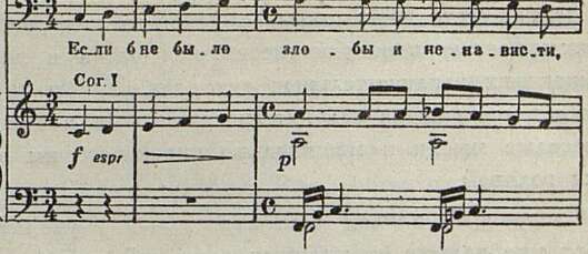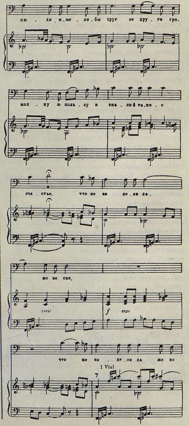 Следующий эпизод (см. стр. 32–33) уводит героя еще дальше от мрачных раздумий; это мечты Бронзы о людском счастье (возможно ли, чтобы прежний Бронза подумал обо всех людях!) — счастье, которое могло бы прийти на землю, если бы она была свободна от злобы и ненависти. Прекрасная светлая тема широкого дыхания время от времени словно застилается тенью (на словах о счастье!), окружается прозрачно-воздушными, хрупкими голосами сопровождения: ведь Бронза всего лишь мечтает о том, что могло бы быть.