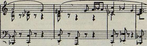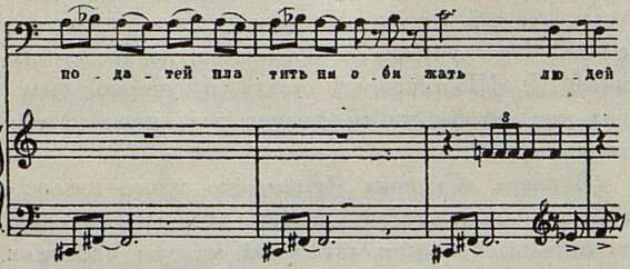 Ладовое строение этой темы усложняется остинатным басовым голосом сопровождения, выдержанным в фа диез миноре. Мелодия выступает таким образом одновременно как бы в двух ладовых и тональных значениях (в фа мажоре и фа диез миноре), налицо явные черты политональности1. Ладовое заострение темы имеет здесь глубокий психологический смысл, танцевальная мелодия окрашивается в сумрачные тона, в ней появляются нотки страдания, боли, щемящей тоски. В. Флейшман отталкивается от еврейского фольклора, воспроизводя распространенный тип трагикомических песен-плясок: бедняк задавлен нуждой, несчастьями, и лишь природный юмор спасает его от полного отчаяния, ему остается пуститься с горя в пляс. Однако, если в народном творчестве сущность образа раскрывает контраст содержания текста и танцеваль-