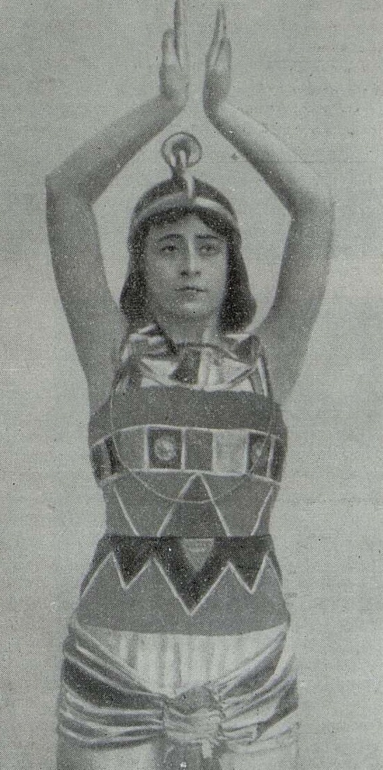 И вдруг из левой кулисы вышла тоненькая, закутанная в узкое одеяние девушка с худыми руками подростка и гордо посаженной головой. Ее несколько фронтальные жесты были так естественны, словно она сошла прямо с египетского барельефа. Мы переглянулись и уставились на нее, будучи уверенными, что это какая-нибудь молоденькая балерина, приглашенная на роль любимой служанки Амнерис.