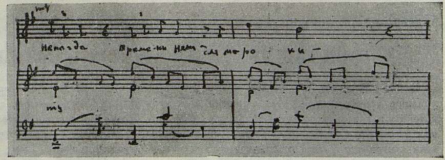 Фрагмент автографа романса «Некогда мне над собой измываться» на слова А. Твардовского (написано левой рукой)