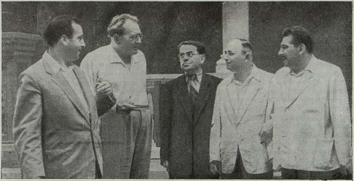 Шебалин с участниками первой постановки «Укрощения строптивой» в Большом театре: Г. Ансимовым, 3. Халабалой, А. Гозенпудом и Е. Акуловым