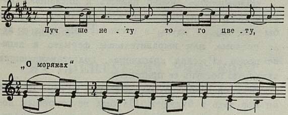 Захаров создает свои «тянущиеся» мелодии преимущественно без резких скачков, с волнистым распевом, начинающимся или с яркого акцента первой доли такта, или с выразительного затакта к этой доле (вот два примера: «Зелеными просторами», «Шел со службы пограничник»).