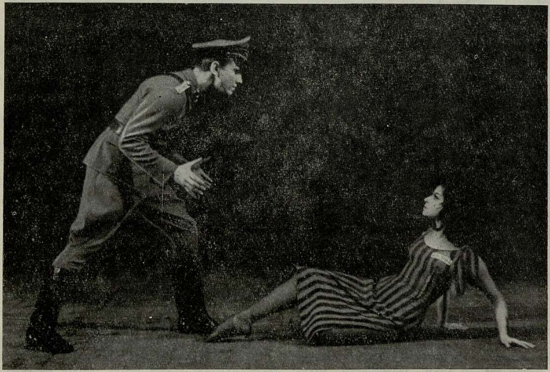 Наиболее значительна по своему идейному содержанию сцена — «Девушка № 55908» Г. Раманиса. Замысел ее возник у молодого балетмейстера Т. Витынь во время посещения Бухенвальда. Драматический сюжет, лаконичное оформление — все производит неизгладимое впечатление, особенно на латышских зрителей, переживших ужасы фашистской оккупации1. Героическая тема звучит и в «Революционном этюде» Шопена, поставленном артистом В. Цукановым в несколько отвлеченном, обобщенном плане, ню исполненном им с большим подъемом и увлечением. Свежо и остроумно решен «Мексиканский танец». Идея его также родилась под непосредственным впечатлением, во время гастролей по странам Латинской Америки; в них принимала участие А. Бауман, которая теперь весело, задорно исполняет вместе с талантливым постановщиком и танцовщиком В. Блиновым эту комическую сценку свидания рыбака и его возлюбленной. И здесь превосходно найдены сценическое оформление и красочный костюм девушки (художник — Мирдза Кангар). Интересны три миниатюры в постановке Л. Якобсона, которые нашли в Риге столь же ярких молодых исполнителей, как в Ленинграде: очаровательны И. Каруле и Г. Ритенберг в «Венском вальсе» Р. Штрауса, трогательны совсем юная А. Драгон и Б. Адамок в «Слепой» Понса — Хейфеца, остро сатиричен Л. Шмит в «Подхалиме» Г. Цитовича.