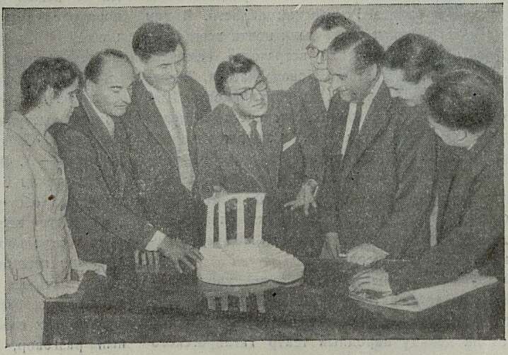 Н. Константинеску (в центре) и Г. Вайнеску (второй слева) знакомят артистов театра с макетом декорации к «Лизистрате»