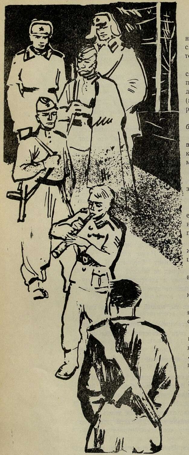 ...На рассвете бойцы рассматривали немца. Он вызывалв них насмешку. Особенно смешили его непомерно большие, красные уши, улыбчивое лицо и большое родимое пятно немаленьком лбу у самой переносицы.
