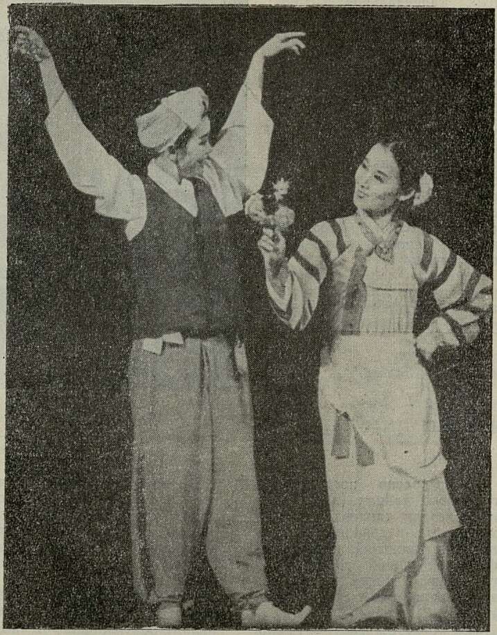 А сколько очарования и поэтической прелести в таких народных танцах и хореографических сценах, как «Пастух и девушка» (постановка Ан Сон Хи, музыка Цой Ок Сама). С неподражаемым изяществом молодые танцоры Таи Ден Дя и Цой Дин Сю проводят сцену объяснении в любви. Полон очарования танец «Бонсеиму» (постановка Ло До Ена, музыка Ойн Ен Чиля) — народная легенда о небесных феях, спускающихся на землю, чтобы полюбоваться красотой алмазных гор. «Танец с барабаном» исполняет Цой Ден Суя с безупречным вкусом и покоряющей пластичностью.