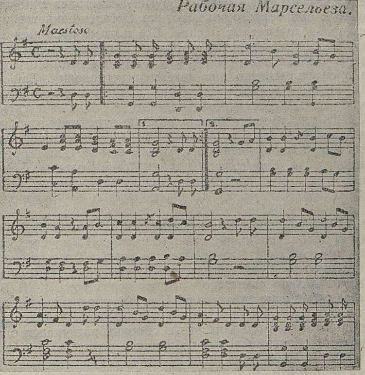 ложением напечатать новый сборник. Ознакомившись с рукописью, он спокойно сложил все мои нотные листки и вернул мне рукопись. Когда я попытался было обосновать свое предложение ссылкой на манифест и на новый закон о свободе печати, он иронически усмехнулся, добавив с горечью: «Избавьте меня от ночного полицейского наводнения в моей типографии». Я понял, что дальнейшие разговоры ни к чему не поведут, и решил наведаться у других владельцев типо-литографий. Но результат был везде один и тот же. Остался единственный путь — путь подпольного способа печати. Все нотные рукописи были мною переданы хорошим копиистам, переписавшим все номера без текстов и заголовков. Переписанный материал поступил в цинкографию, работавшую преимущественно для нелегальных изданий. Там подобрали тексты к нотам и изготовили клише для всех десяти номеров. Эти клише мне удалось «бесшумно» доставить в большевистскую типографию РСДРП, где сборник был полностью отпечатан в количестве десяти тысяч экземпляров при активном содействии покойного тов. А. А. Белякова, старого большевика. Сборник был оттуда препровожден в брошировочную. Типография находилась в Большом Казачьем пер. (в Петербурге), а брошировочная — недалеко от типографии (точного адреса теперь не помню), где-то очень близко от Загородного проспекта.
