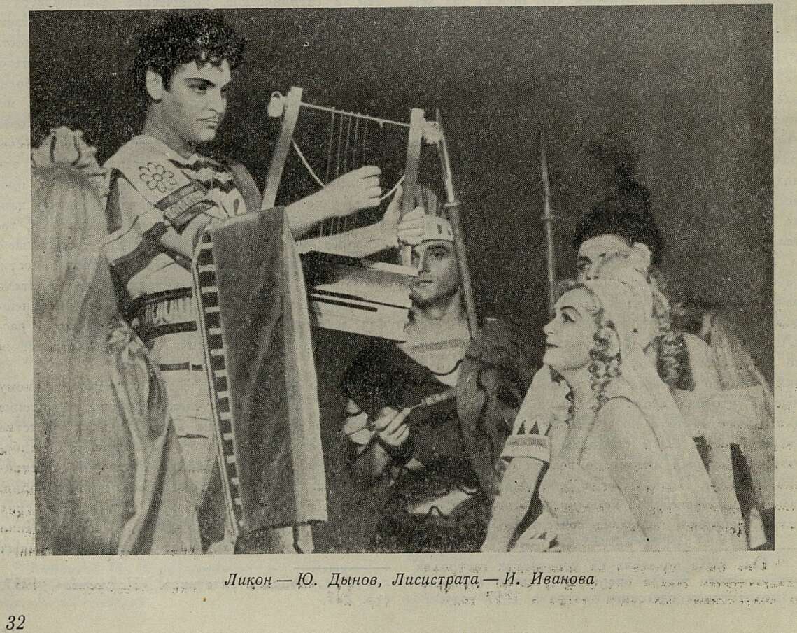 Мне кажется, что авторы либретто в своей работе применили принцип, близкий к тому, который в свое время считал обязательным Вл. Немирович-Данченко. Он полагал, что русский текст «Лисистраты» Аристофана должен быть не столько переводом аристофановских слов и предложений, сколько смысла этих слов, острот, мыслей, что изложение их должно быть понятным для нашего зрителя, но чтобы они, нe теряя своей откровенности, были свободны от непристойного оттенка, который неминуемо возник бы в дословном переводе. Правда, тогда речь шла о переводе самой аристофановской комедии. В основу же оперетты Дендрино положена совершенно новая современная пьеса. К ее достоинству надо отнести и такое качество, как насыщенность, если можно так сказать, «аттической солью». Так возникает, опять-таки в весьма своеобразной форме, чисто аристофановская откровенность. Но все это в меру, и зритель присутствует при целомудренном и чистом спектакле, несмотря на несколько рискованные положения и неожиданно откровенные сравнения.