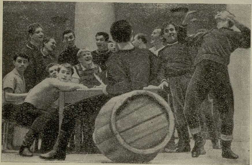 Вечерами, когда фойе и залы Центрального Дома Советской Армии заполняет публика, все здесь выглядит праздничным и нарядным. А днем в залах пусто и полутемно, парадная лестница перегорожена каким-то барьером и приходится идти по другой, которая неожиданно приводит нас на балкон концертного зала. Это приятная неожиданность, ибо снизу слышатся звуки рояля, и, посмотрев на сцену, мы понимаем, что можно начинать репортаж: балетмейстер Александр Петрович Хмельницкий репетирует с артистами танцевальной группы. Они стоят в живописных позах вокруг стола, один из них сидит на бочке. Вся эта группа удивительно напоминает композицию репинских «Запорожцев», приготовившихся писать письмо турецкому султану.