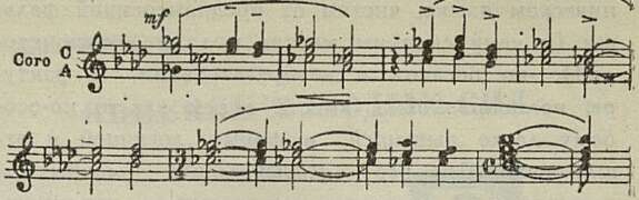 Большую экспрессивность придает музыке поэмы удачное применение женского хора без слов. Композитор вводит и приглушенное, тоскливо звучащее пение с закрытым ртом, и обычный тембр голоса. В наиболее напряженных моментах произведения автор предельно уплотняет хоровую фактуру и достигает особой силы вокально-симфонического звучания. Таково кульминационное проведение побочной партии в экспозиции: